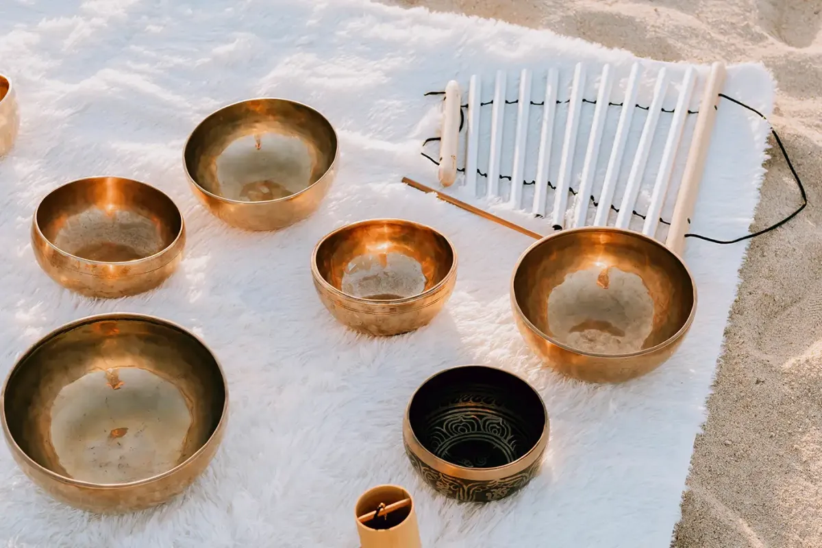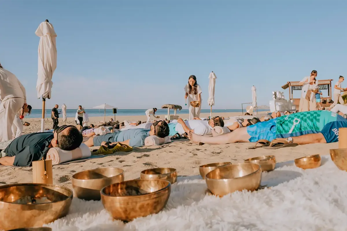 Using soothing frequencies and gentle, intentional guidance, sound baths help the body shift out of stress and into deep rest. Guests often describe feeling lighter, calmer, and more centered afterward. It’s a supportive experience for relaxation, nervous system balance, and overall well-being, perfect for a slow morning, sunset session, or as a meaningful moment during a celebration or retreat.The guests relax comfortably on floor mats as the soothing tones of singing bowls, chimes, and gongs fill the space with gentle vibrations, fostering deep relaxation, mental stillness, and a profound sense of grounding and calm.