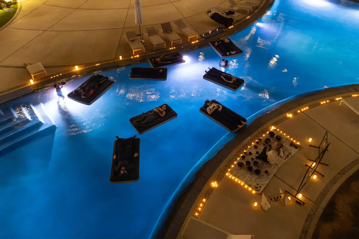 Guests recline on a floating mattress or aquatic hammock as immersive sound vibrations gently envelop the body, deepening relaxation and evoking a serene sense of weightlessness and tranquility.