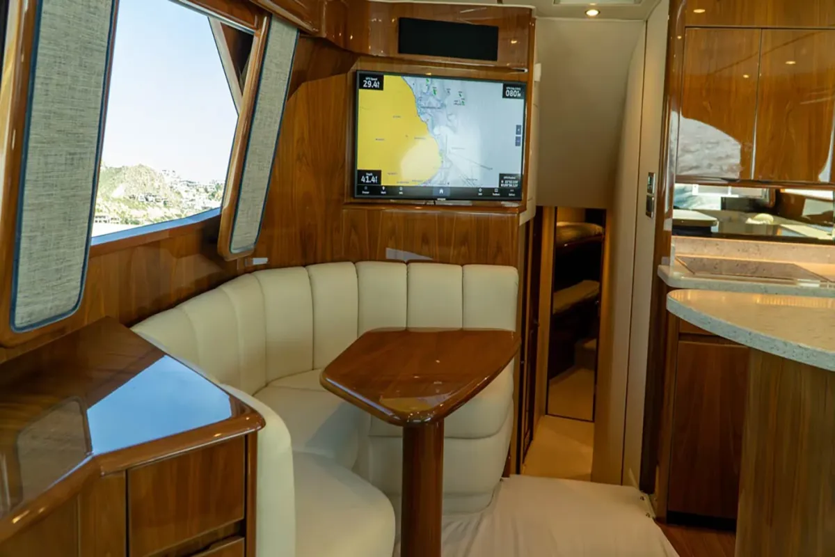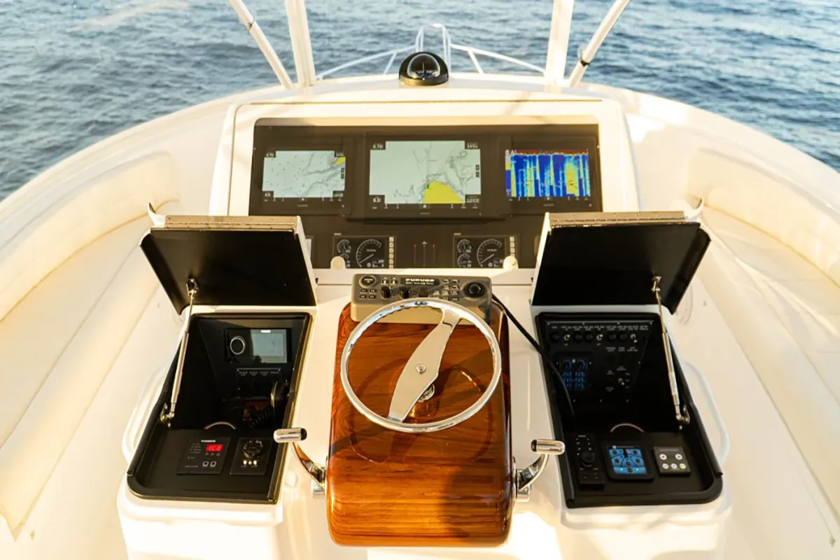 Navigate confidently with Garmin GPS and Radar, stay in touch with dual Garmin VHF radios, and locate fish with pinpoint accuracy using the Garmin Fish Finder. Stay cool and comfortable under the sun canopy, enjoy entertainment on the flat screen TV, and refresh with the ice cube maker — all designed to elevate your day at sea.