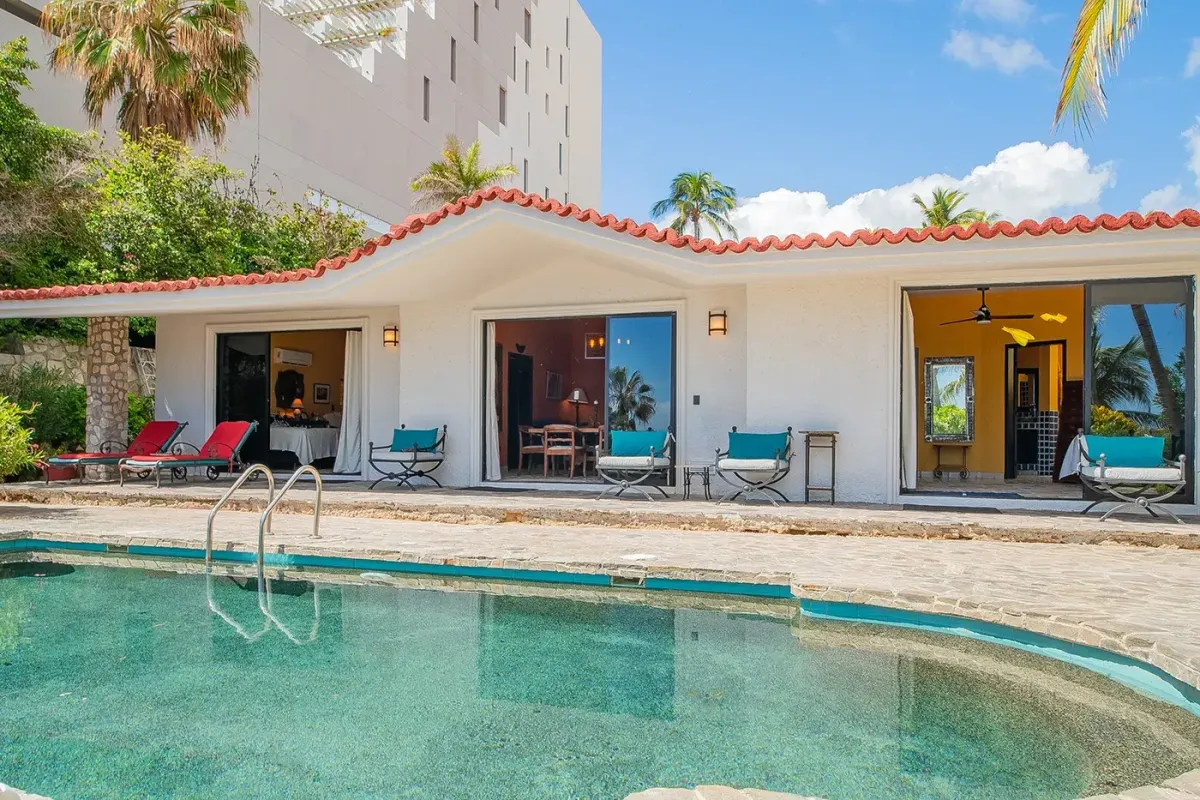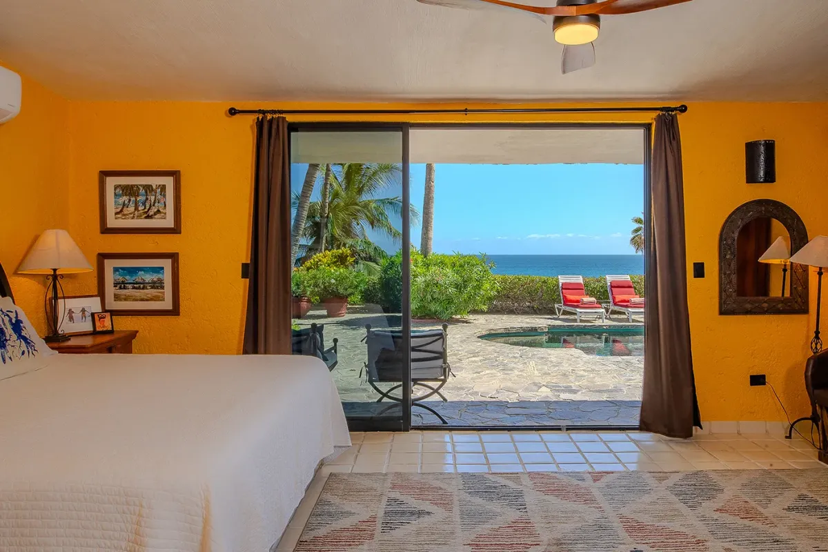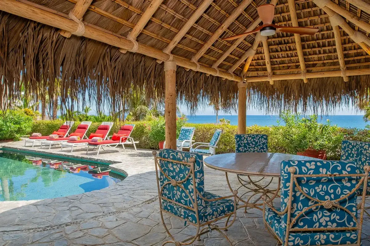 Outside, the private pool and sun terrace are the heart of the villa – framed by tropical landscaping and views of the ocean beyond. A shaded palapa and built-in barbeque create a perfect setting for alfresco dining or sunset gatherings, while the sound of the waves provides the backdrop.