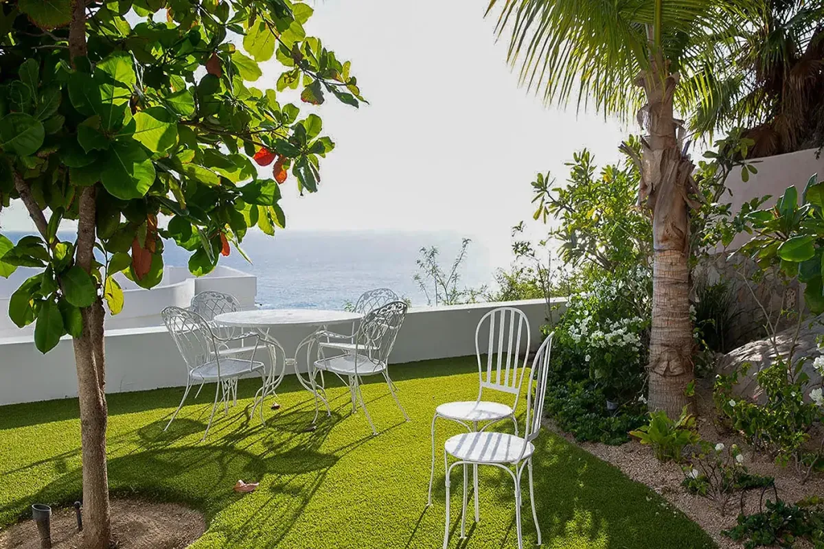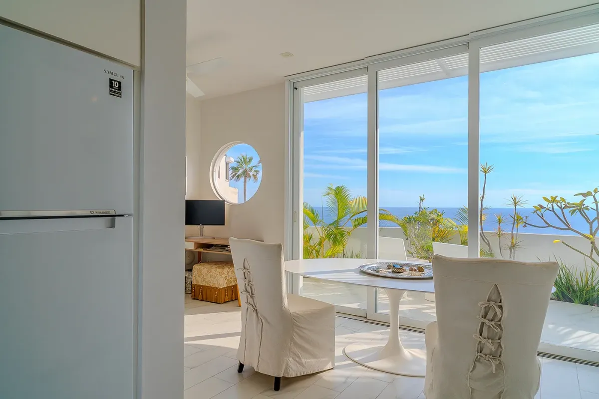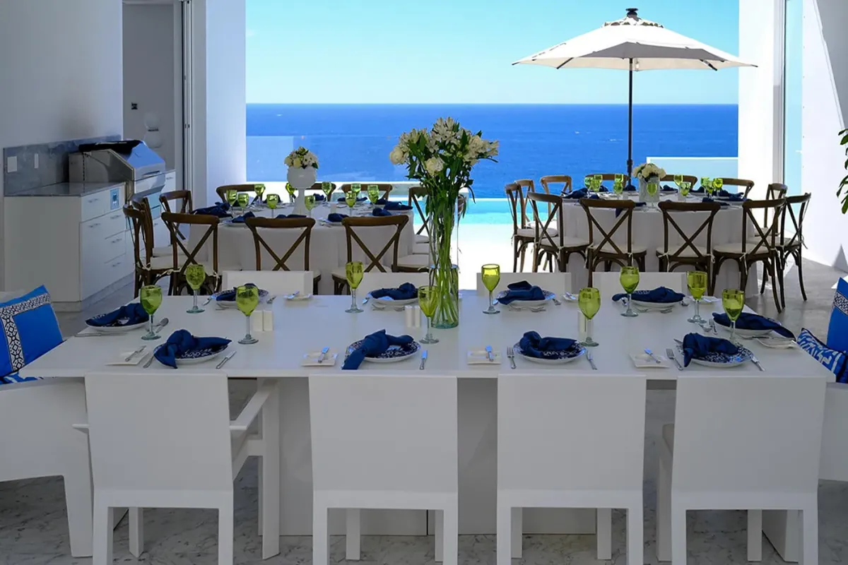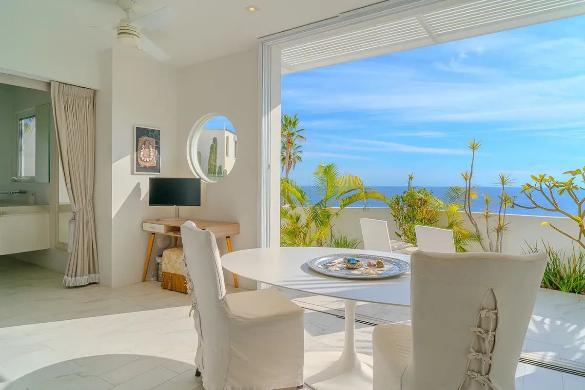 Inside, the villa continues to impress. Marble floors, an open-air atrium, and a spacious living and dining area with retractable doors create a bright, airy ambiance. Each guest suite features sweeping ocean views and a private bath. The primary suite elevates luxury with an oversized soaking tub and a retractable-roof shower for an unforgettable open-air experience under the stars.