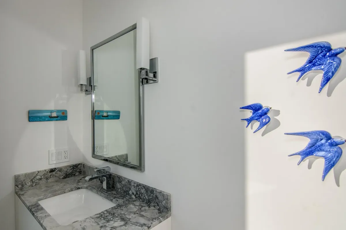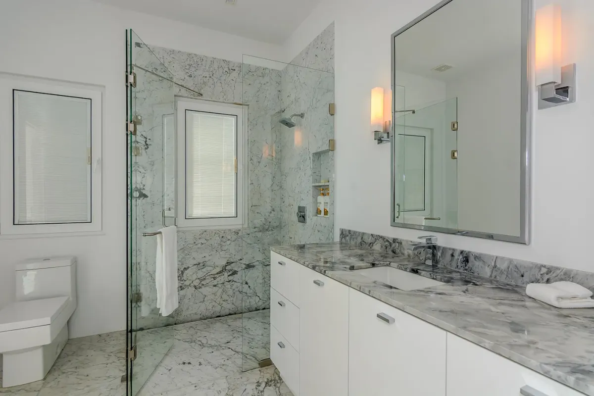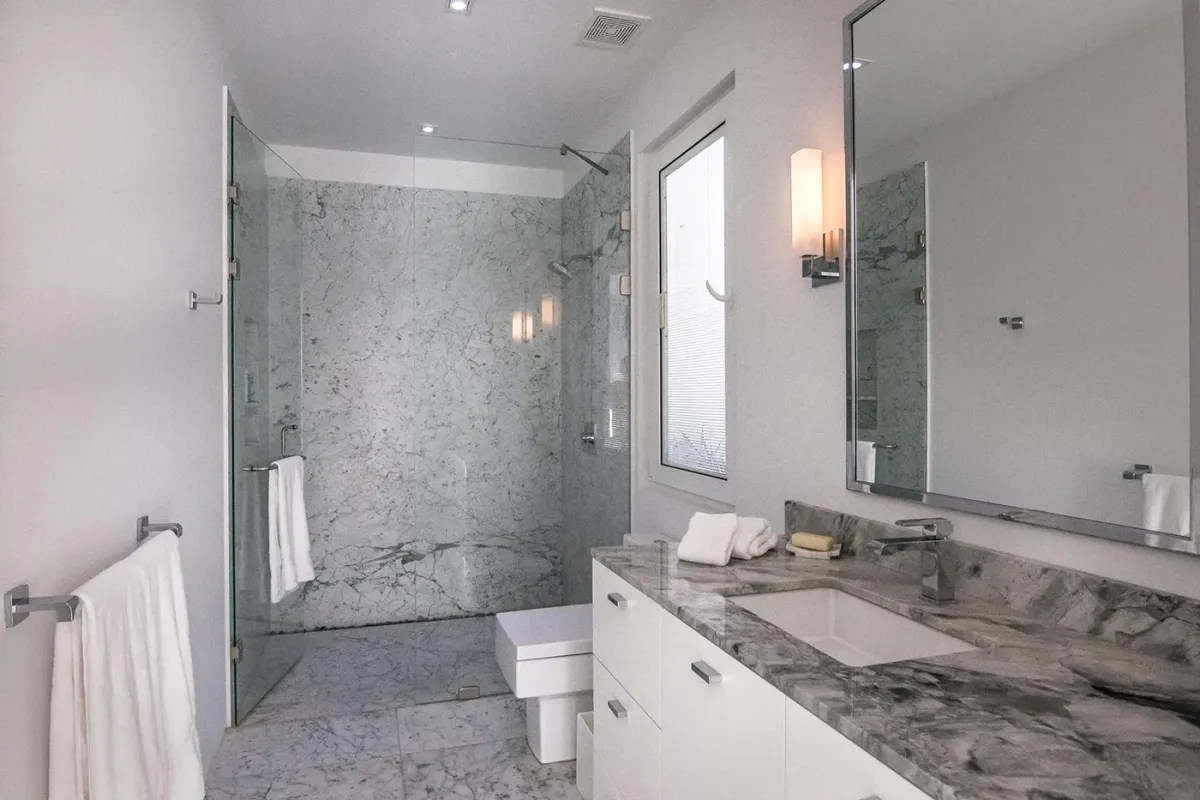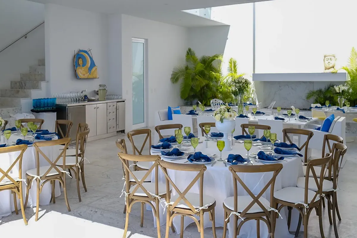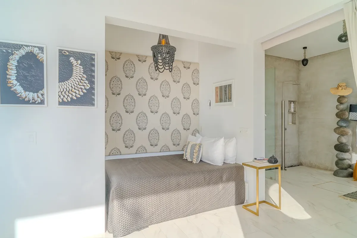 Inside, the villa continues to impress. Marble floors, an open-air atrium, and a spacious living and dining area with retractable doors create a bright, airy ambiance. Each guest suite features sweeping ocean views and a private bath. The primary suite elevates luxury with an oversized soaking tub and a retractable-roof shower for an unforgettable open-air experience under the stars.