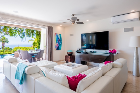 Expansive windows frame breathtaking Pacific Ocean blues at beautiful Villa Esencia Del Mar. Enjoy the mesmerizing panorama of the beach, ocean, and Pedregal hillsides from your private swimming pool and terrace. Watch whales and ships pass along the coastline as you unwind in style. This updated retreat is tastefully decorated with designer touches, elegant furnishings, colorful artwork, and modern amenities to make your stay unforgettable.