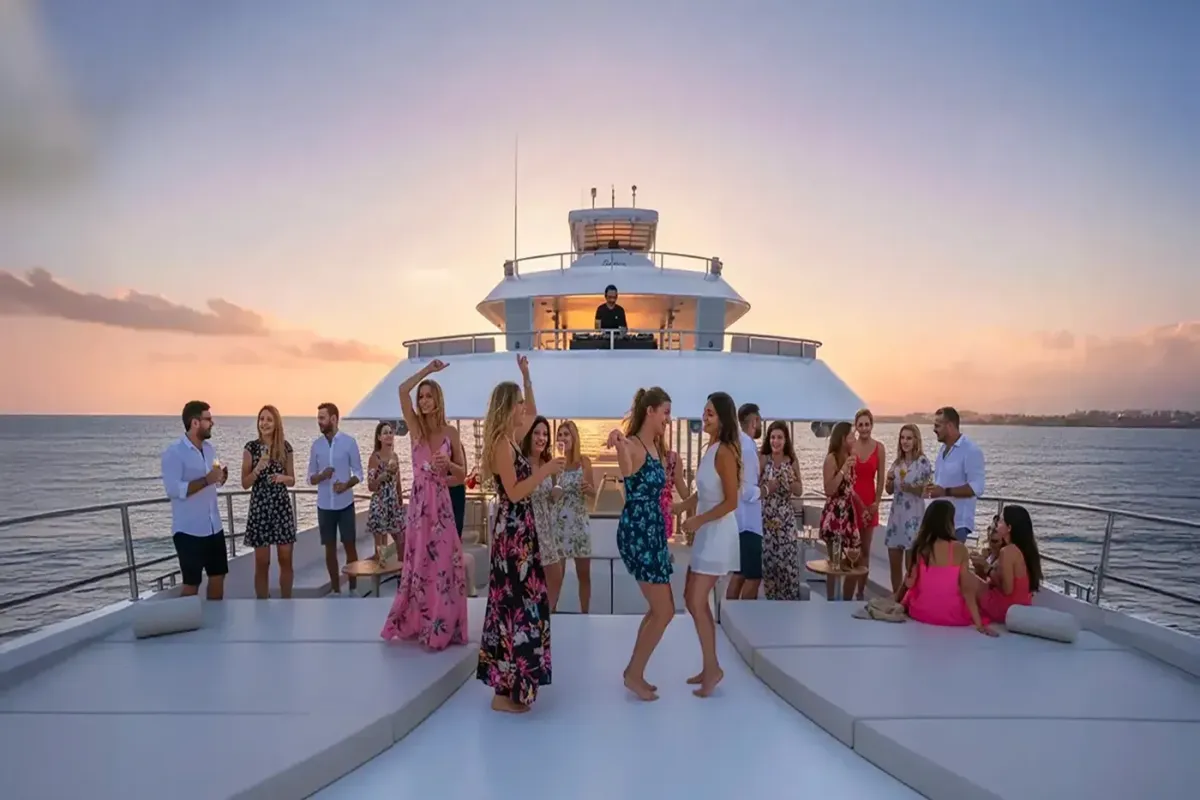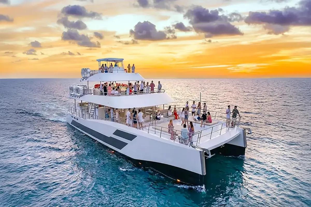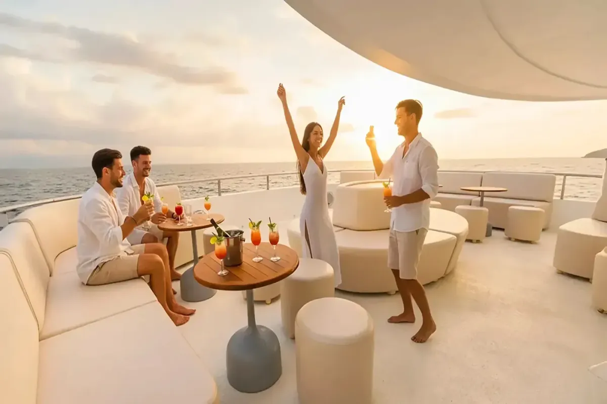 Onboard, guests enjoy luxury-level service with an unlimited open bar and a curated chef-style menu, designed to complement the experience without the formality of a seated meal. Multiple decks, shaded lounges, and open sun areas allow guests to move freely and enjoy the cruise at their own pace. As the sun begins to set, the atmosphere transforms into an energetic yet refined celebration, featuring music, lively entertainment, and Cabo’s unforgettable sunset views over the Pacific.